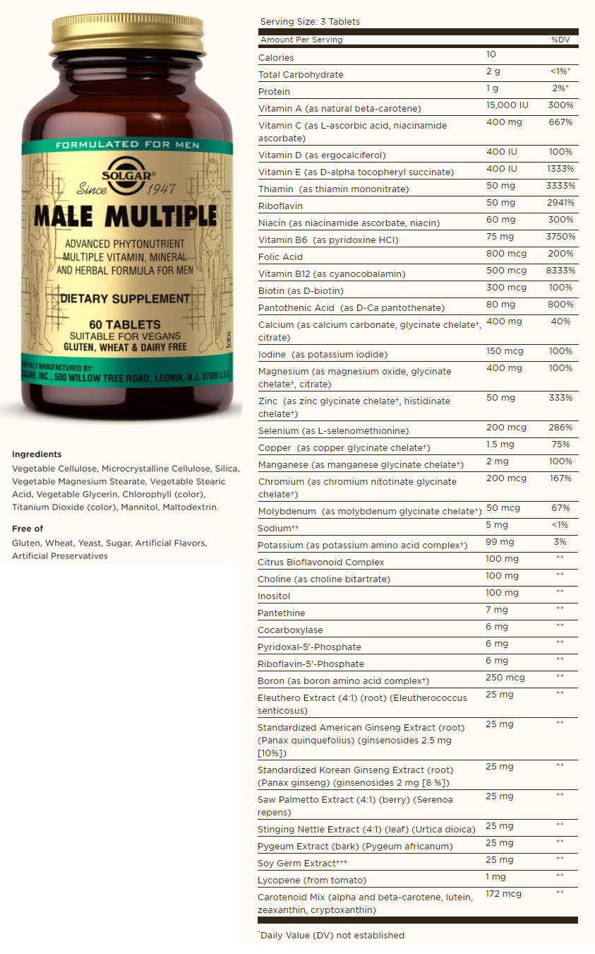 Male Multiple Tablets is one of Solgar’s premium-quality mens health products. Advanced phytonutrient multiple vitamin, mineral and herbal formula for men.